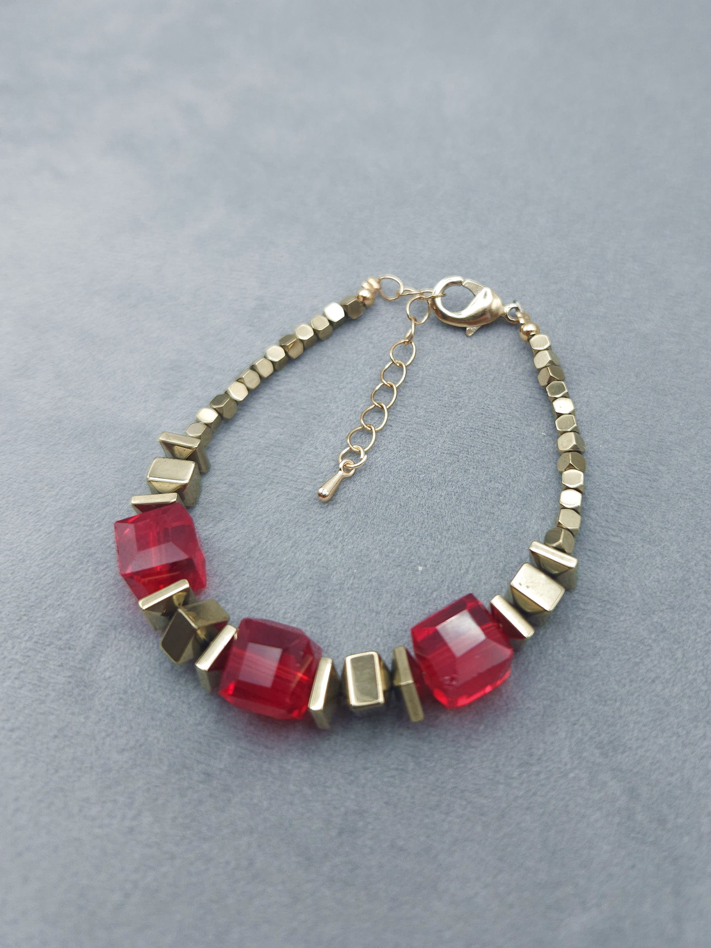 Браслет «алый куб» из кварца и пирита. Длина 18 см, Вес 15г. Кварц алый (Памир), Пирит куб/пирамида (Испания)