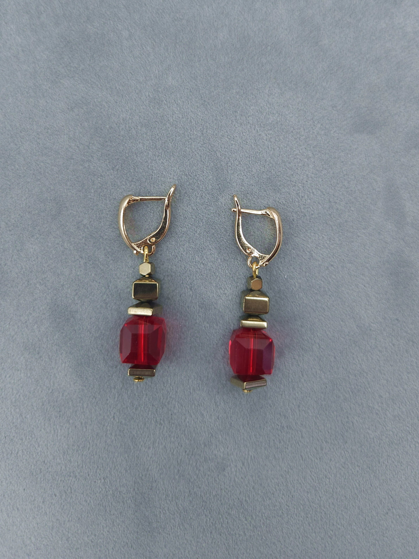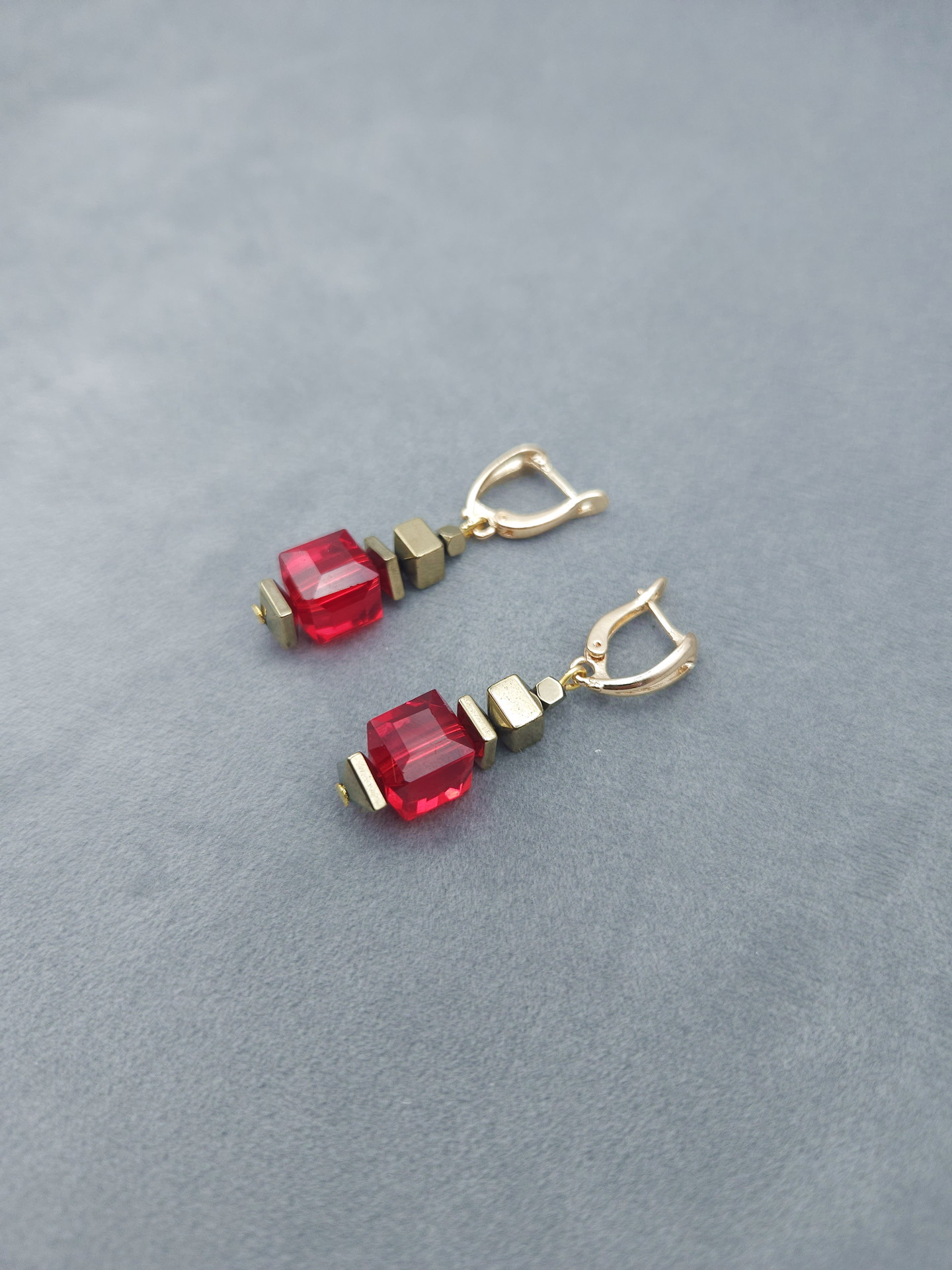Серьги «алый куб» из кварца и пирита. Длина 3 см, Вес 9.5г. Кварц алый (Памир), Пирит куб/пирамида (Испания)