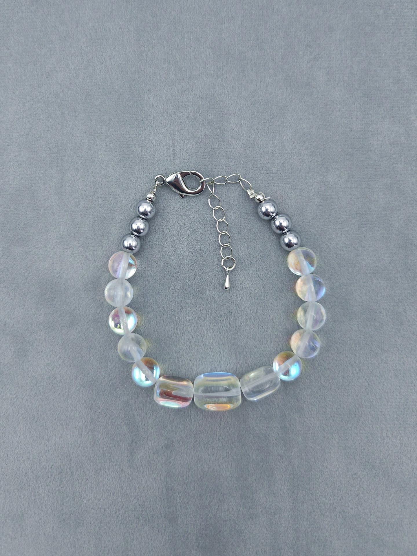 Браслет «опал» бесцветные с благородным мерцанием. Длина 18см, Вес 15г. Гиалит бесцветный благородный из при. фракции (Памир), Гематит (Тайвань).