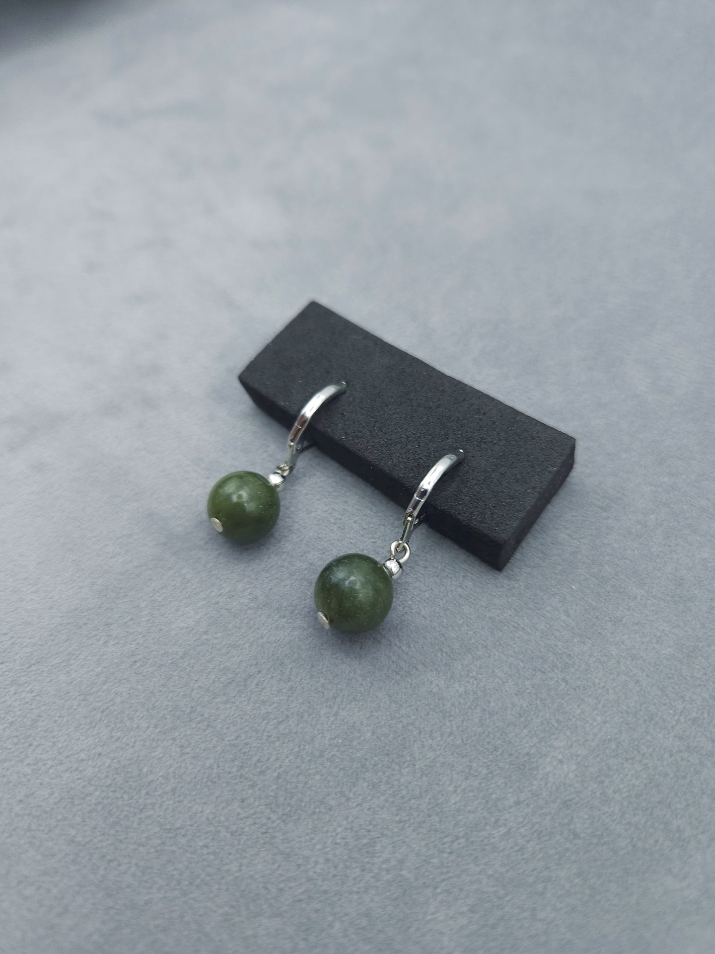 Серьги из нефрита. Шар 10мм, Вес 3.5г. Французский замок родий.